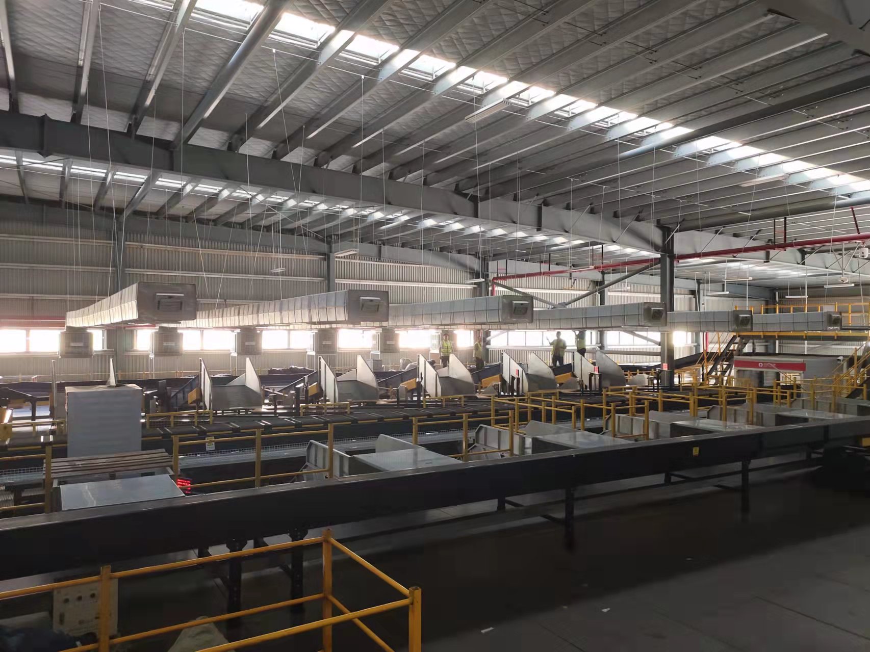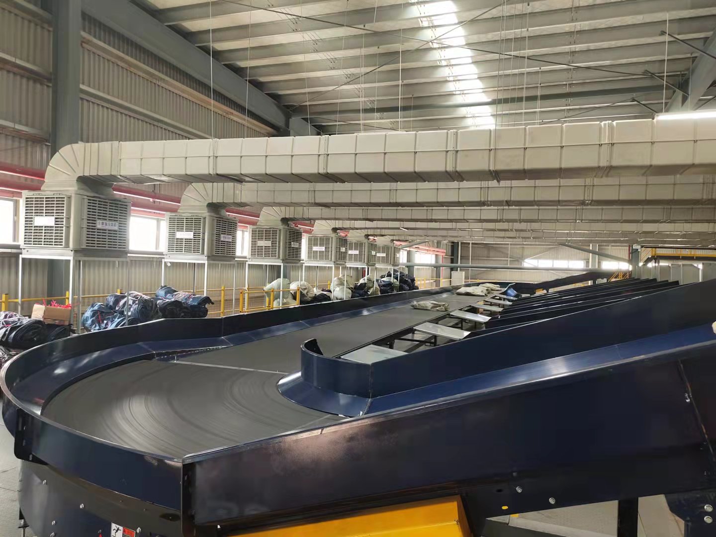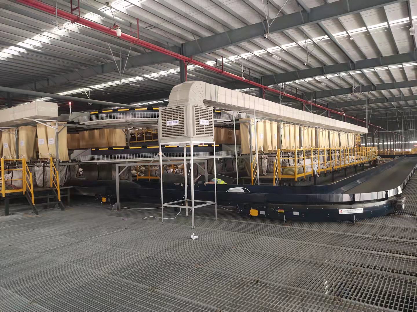 百世集團廣州番禺分撥是一家大型物流運轉(zhuǎn)中心,場地面積50000平方,倉庫主體是鋼結(jié)構(gòu),廣州夏季溫度高倉儲運轉(zhuǎn)設(shè)備發(fā)熱多等特點,夏季庫房溫度達到40度左右,分揀員工無法正常工作,有可能發(fā)生意外和中暑,我公司工程師經(jīng)過現(xiàn)場勘查,設(shè)計50臺夏瑞22型冷風(fēng)機,加裝管道采取定點崗位送風(fēng),另外配XR-730型工業(yè)大吊扇,安裝后室內(nèi)溫度達到30度左右,通過大風(fēng)扇把涼爽空氣送到每個角路,大大的改善了工作環(huán)境,受到領(lǐng)導(dǎo)和員工一直好評。
